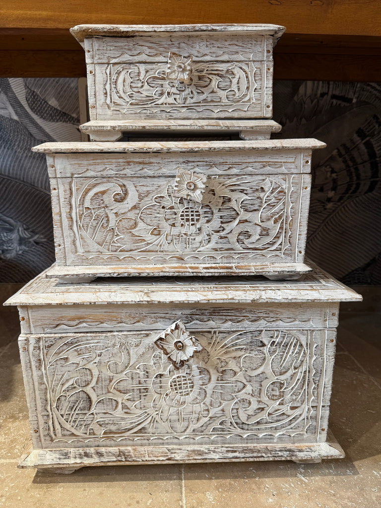 Coffres balinais faits à la main, fabriqués de bois exotique.